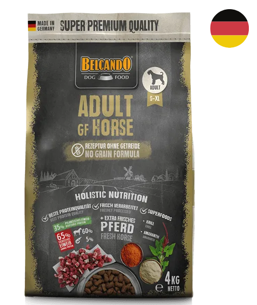 Med ekstra frisk hestekød og udvalgte ingredienser tilbyder BELCANDO Adult GF Horse en helt særlig nydelse for hunde. Takket være den kornfri opskrift og det velsmagende, eksklusive kød er dette tørfoder særligt velegnet til følsomme firbenede venner. Værdifulde ingredienser indeholder næringsstoffer, som kan bidrage til hundens vitalitet og velvære. Amarant som et kvalitetsalternativ til korn leverer vigtige nærings- og vitalstoffer, og kombinationen med krill, en værdifuld kilde til omega-3-fedtsyrer, skaber en særligt afbalanceret opskrift.