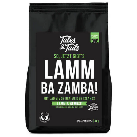 Lam (75 %, heraf lam (frisk, 63 %), lam (tørret, 10 %), proteinhydrolysat (fra lam, 2 %) banan (tørret, 15 %), græskar (tørret, 6,5 %), loppefrøskaller, rødbede (tørret, 0,1 %), cikorie (tørret).